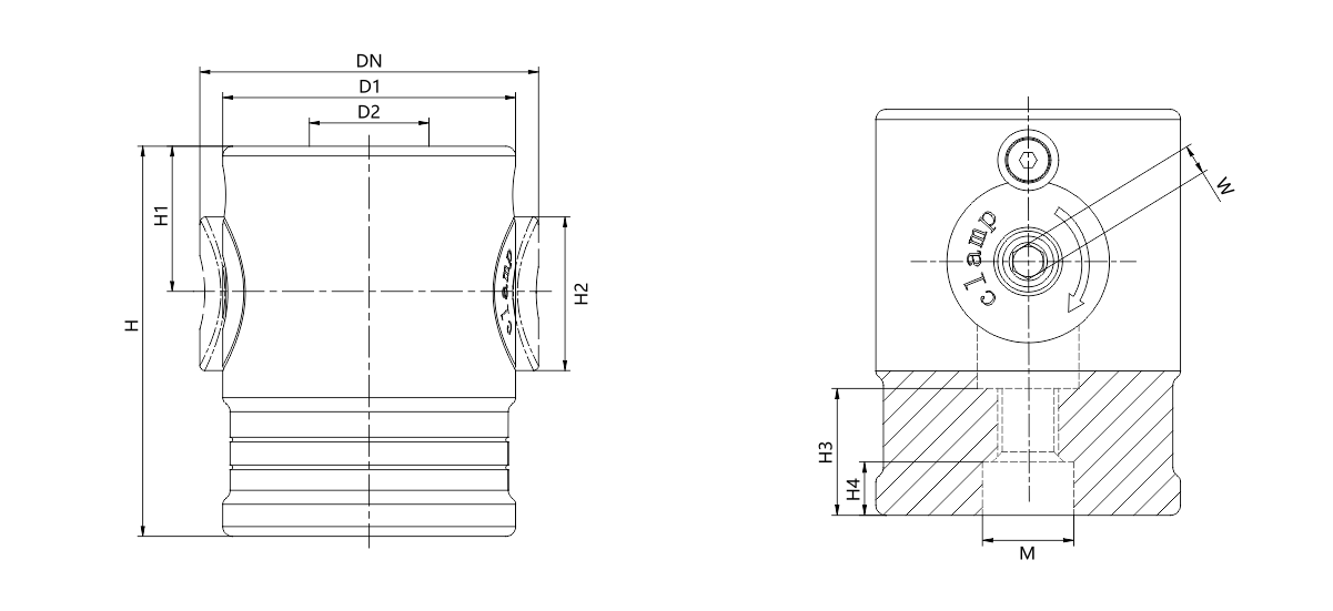 | Dimensjonsnummer | Dn | D1 | ØD2 | H (± 0,01) | H1 | H2 | H3 | H4 | W | M (H7) |